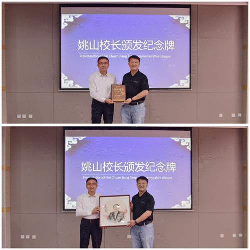 校党委常委、副校长姚山代表学校为李相烨颁发“百川讲堂”纪念牌,并送上我校学生绘制的国画肖像画,以表感谢与敬意。